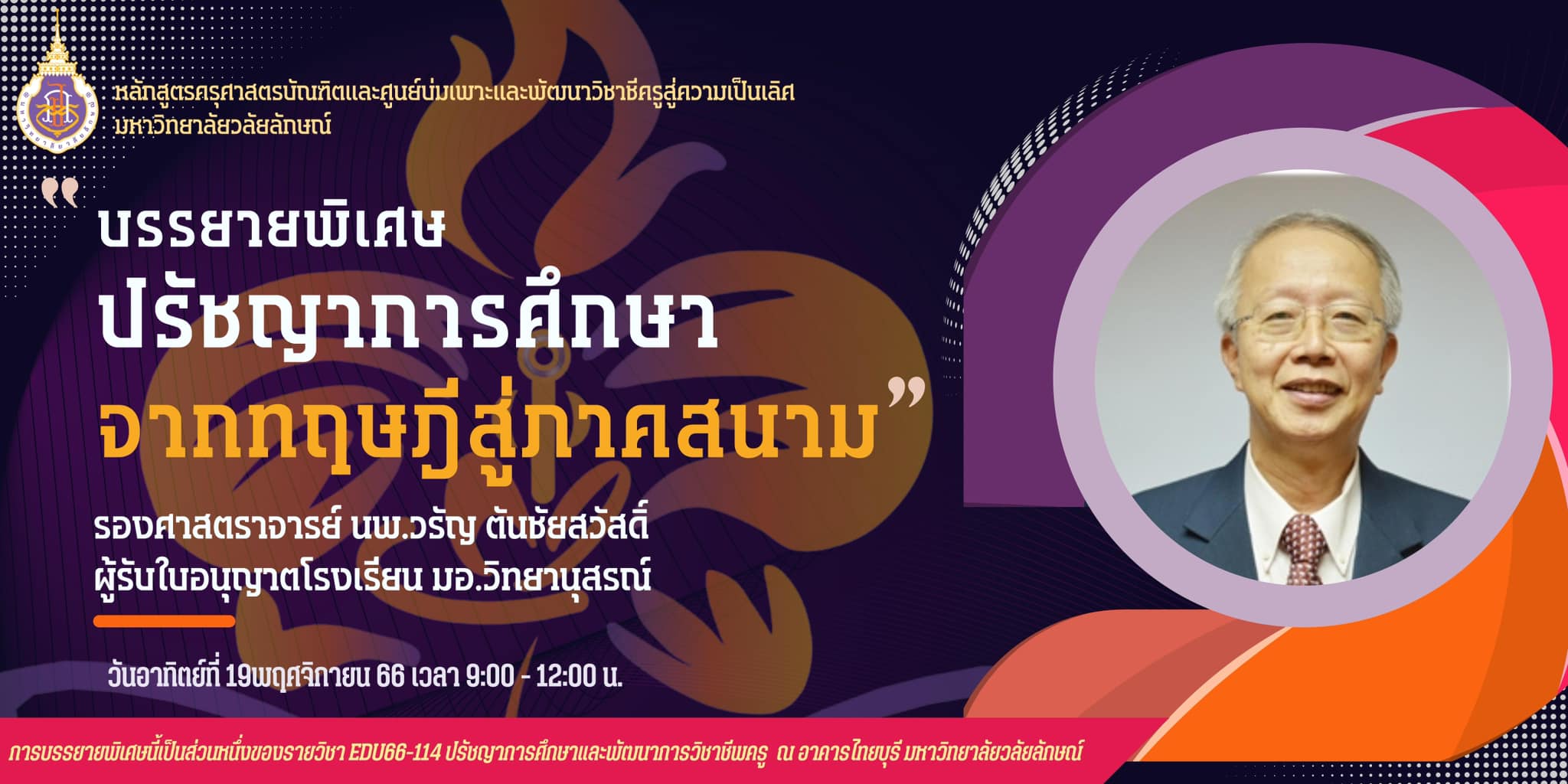 หลักสูตรครุศาสตร์มหาวิทยาลัยวลัยลักษณ์จัดกิจกรรมการบรรยายพิเศษในรายวิชา EDU66-114 ปรัชญาการศึกษาและพัฒนาการวิชาชีพครู ภายใต้หัวข้อ “ปรัชญาการศึกษา: จากทฤษฎีสู่ภาคสนาม” โดยวิทยากรผู้เชี่ยวชาญ รองศาสตราจารย์ นพ.วรัญ ตันชัยสวัสดิ์ ผู้รับใบอนุญาตจากโรงเรียนมอ.วิทยานุสรณ์